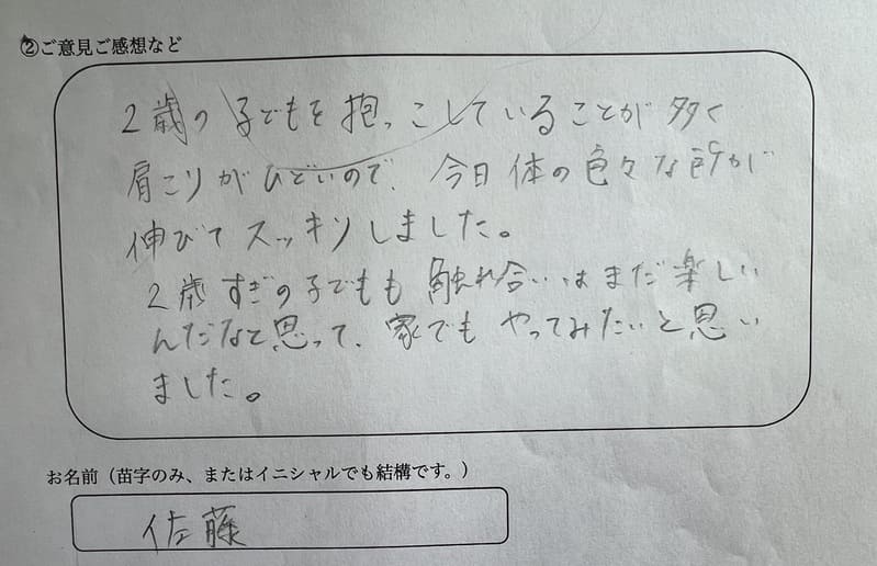 【佐藤様】ベビーヨガ教室ご感想 2025.10.08 【教室】 生徒様の声 佐藤様 2歳の子どもを抱っこしていることが多く、肩こりがひどいので、 今日体の色々な所が伸びてスッキリしました。 「2歳過ぎの子どもも触れ合いはまだ楽しいんだな」と思って、家でもやってみたいと思いました。 Post Share Hatena Pocket RSS feedly Pin it 【すずき様】ベビーヨガ教室ご感想 前の記事 【Y.N.様】ベビーヨガ教室ご感想 次の記事